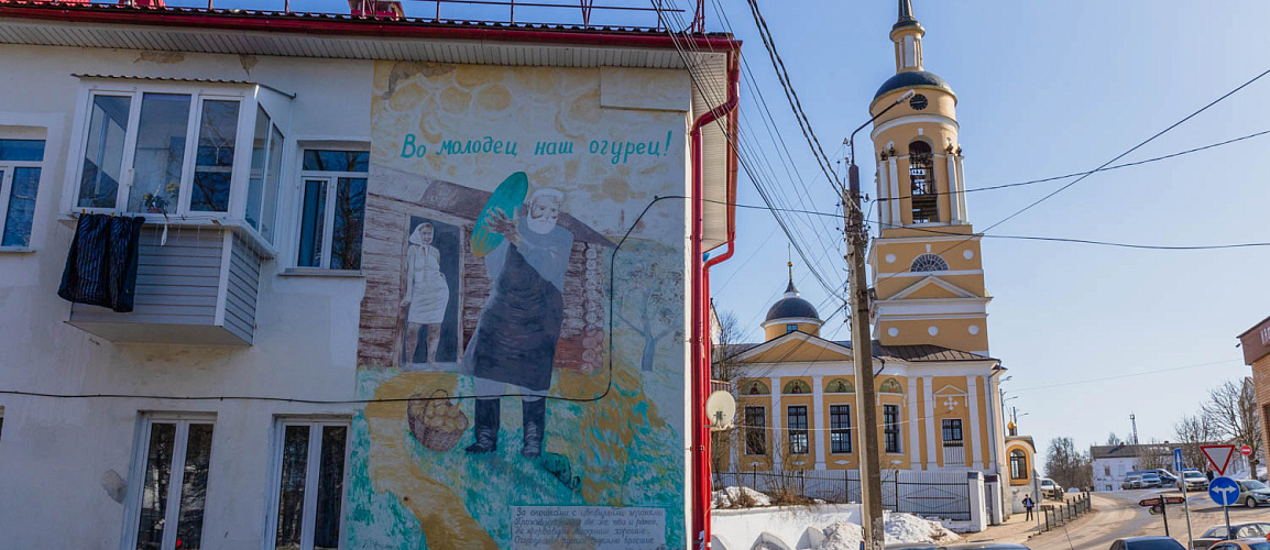 Фрески на стенах. Одна из причин посетить Боровск – разнообразные рисунки на стенах зданий. Автором уличных картин является художник Владимир Овчинников. Сюжеты фресок самые разные – от исторических личностей до жанровых сценок, например, о хорошем урожае и важности совершать добрые поступки.