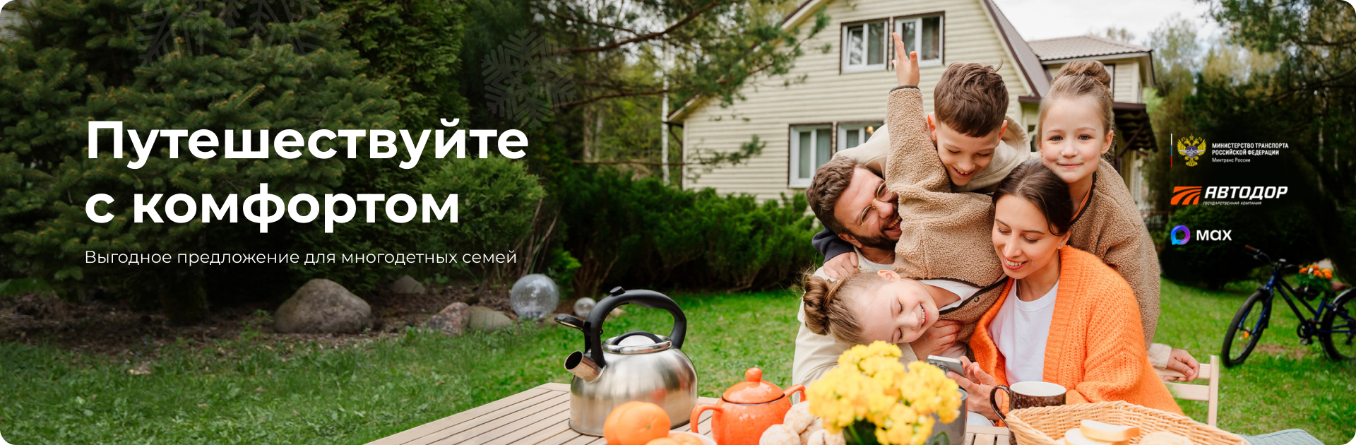 В рамках поддержки многодетных семей Государственная компания «Автодор» проводит акцию «Комфортный проезд для многодетных семей» по начислению 12 000 бонусных баллов Программы лояльности на лицевой счет транспондера T-pass членам таких семей.